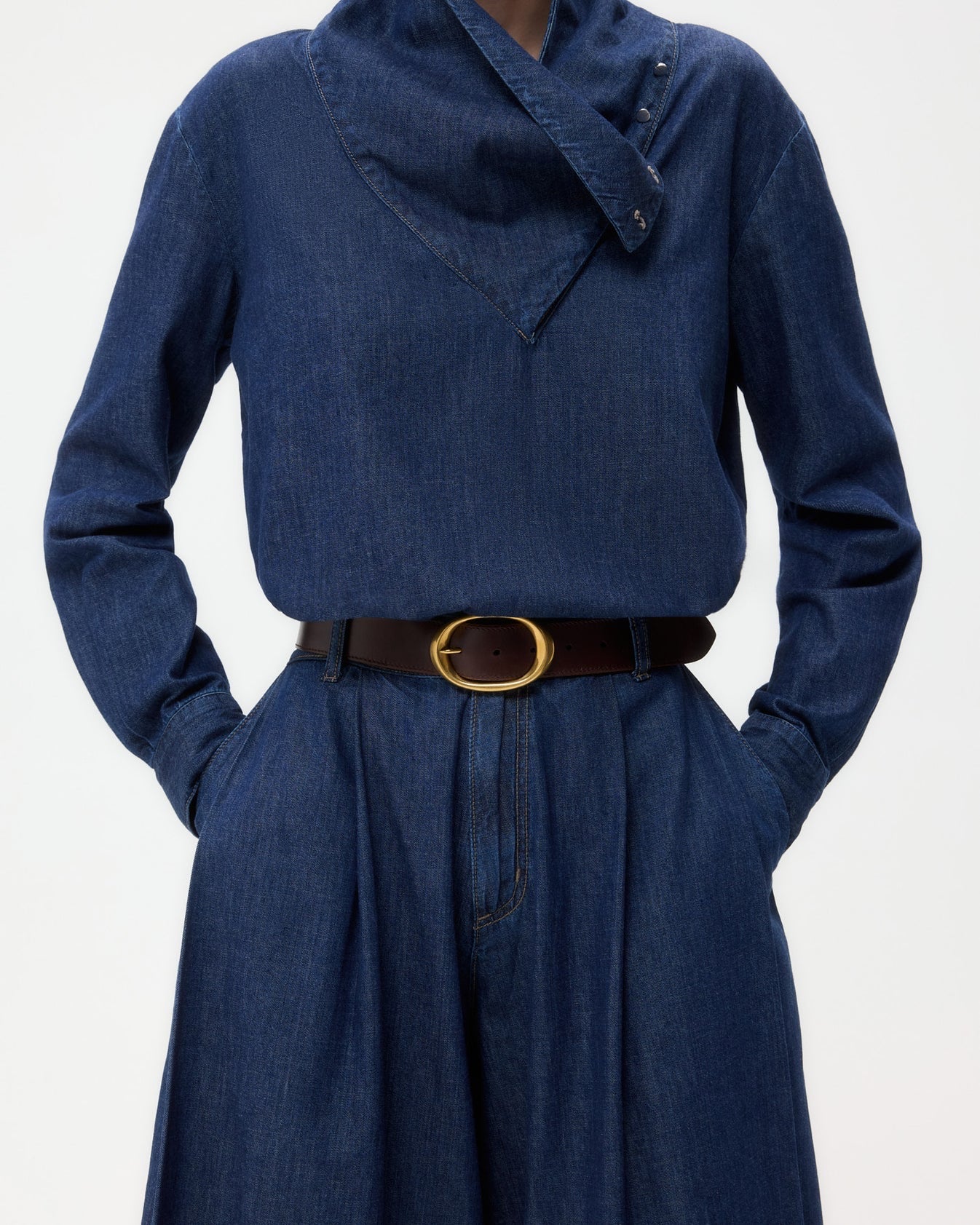 Wide belt in luxe cowhide leather that burnishes and softens over time. The Wide belt is contoured to the natural shape of your body. Accented with custom molded brass buckles, intricately shaped with organic curves and coated with an antique gold finish.