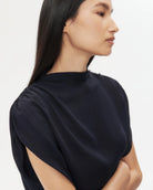 Mock neck, cap sleeved blouse draped in medium weight silk stretch georgette. Wish you would top a loose fit, with a soft drape that skims the body. Complete with a placket trim on one shoulder and pleats on the other shoulder.