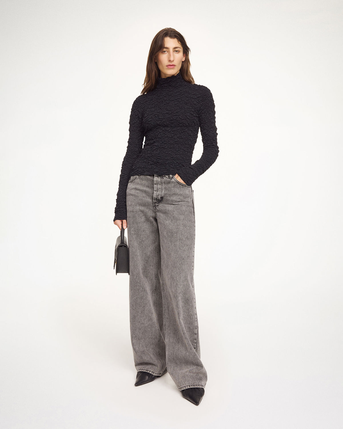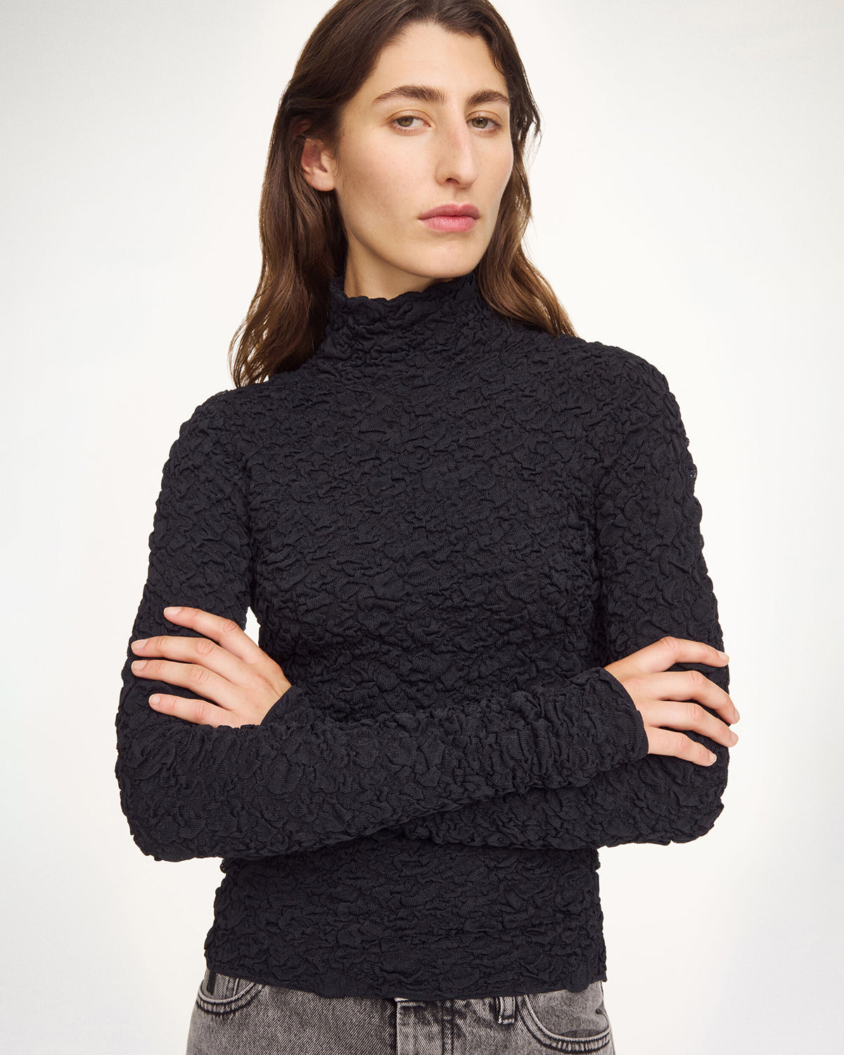 An item that will blend right into your existing edit, the Aura blouse can be styled equally for the office and the after-hours. Made in a stretchy tactile fabrication, the alluring design has a turtleneck and elongated sleeves. Wear with tailored trousers and miniskirts alike.