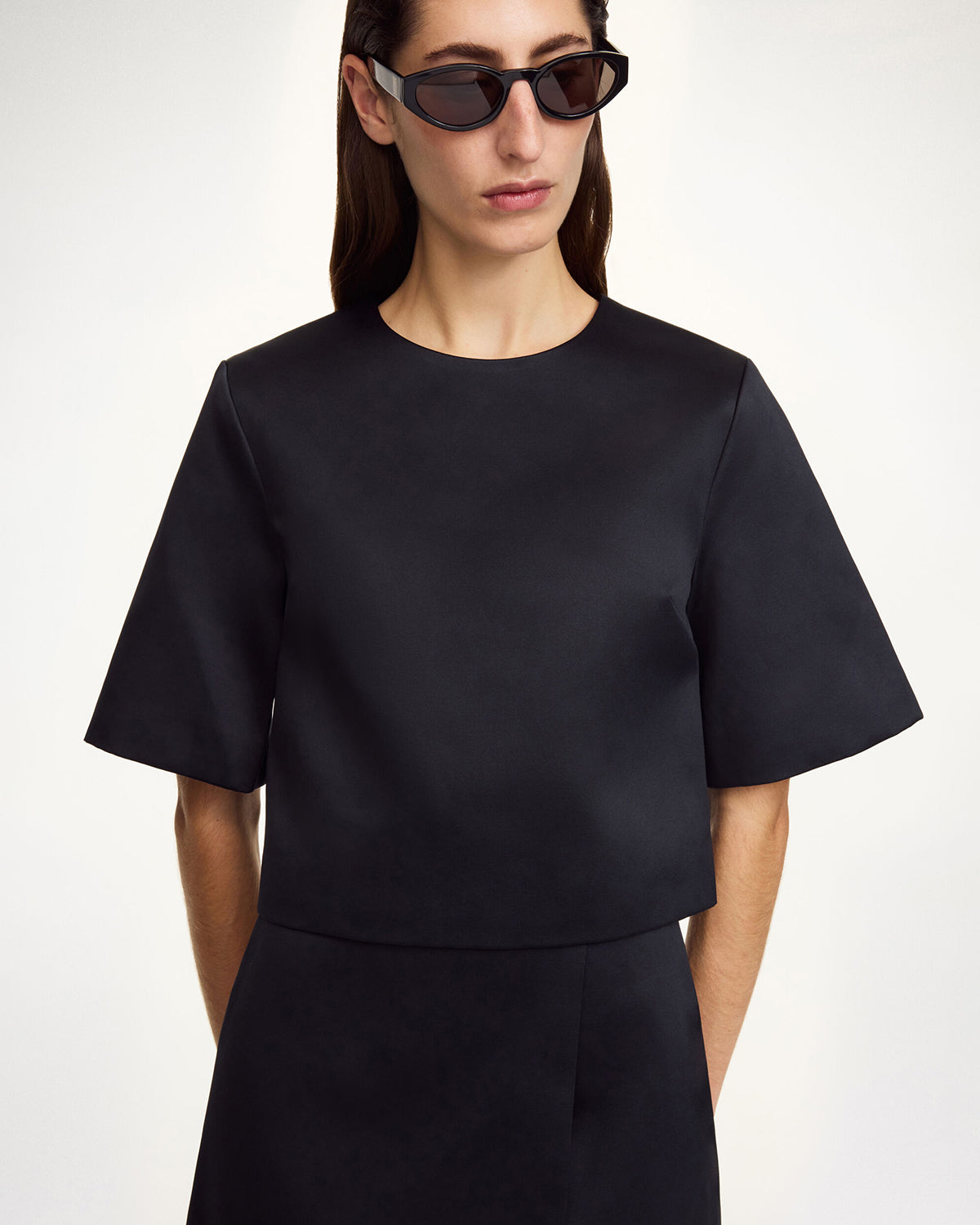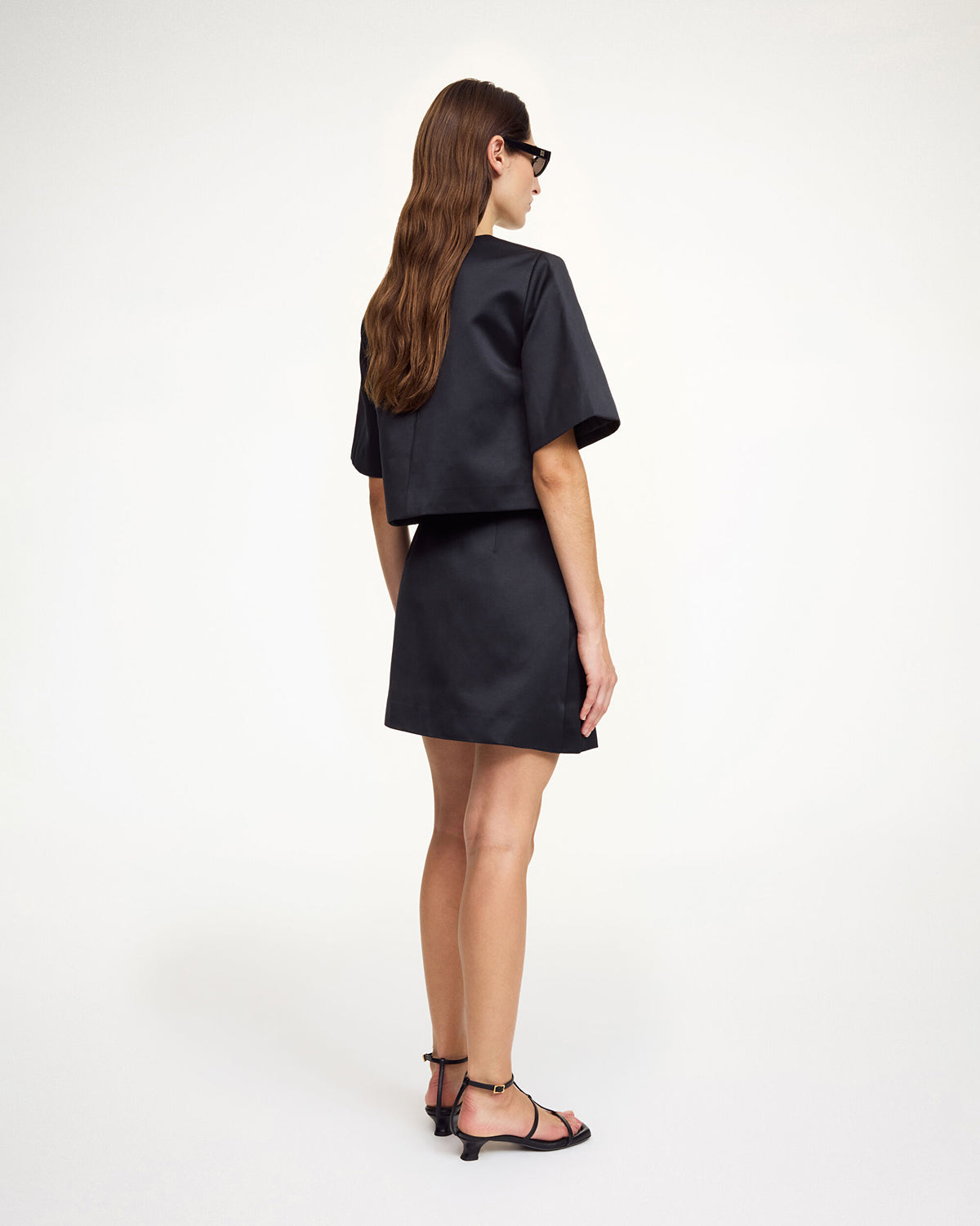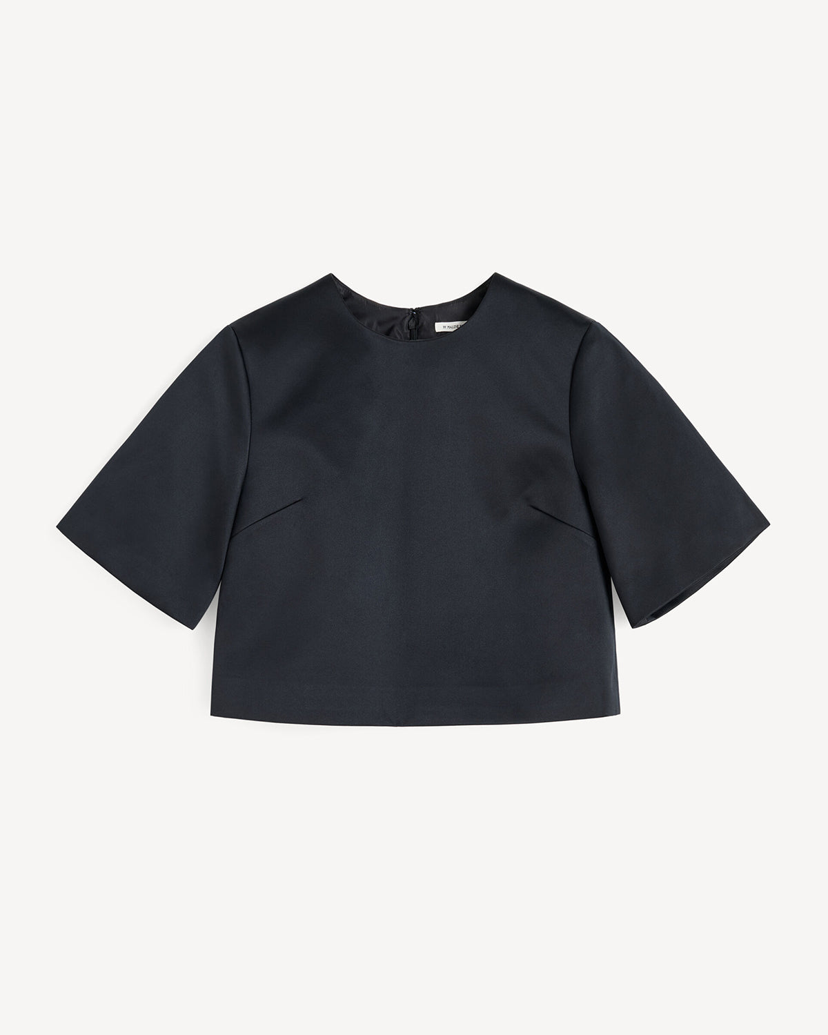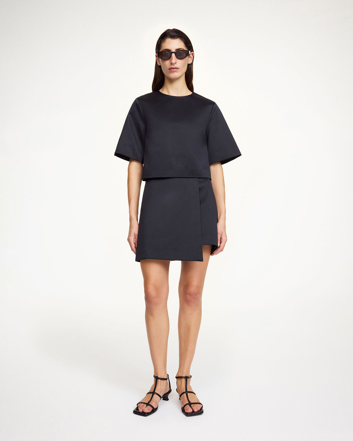 Soothing in hue and timeless in silhouette, the Hania top will fit right into your year-round edit. The slightly cropped T-shirt silhouette closes with a zipper and hook in the back. Pair with the Hermie mini skirt.