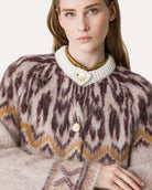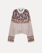 jacquard cardigan in baby alpaca wool featuring a traditional fair–isle pattern on the upper panel. the contrasting collar and gleaming gold–tone sculptural buttons brighten the whole aesthetic, complementing the cropped cut and slightly boxy shape. the contrasting collar comes in cashmere wool.
