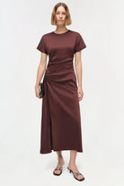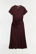 The Marabella Draped Satin Midi Dress in Mahogany