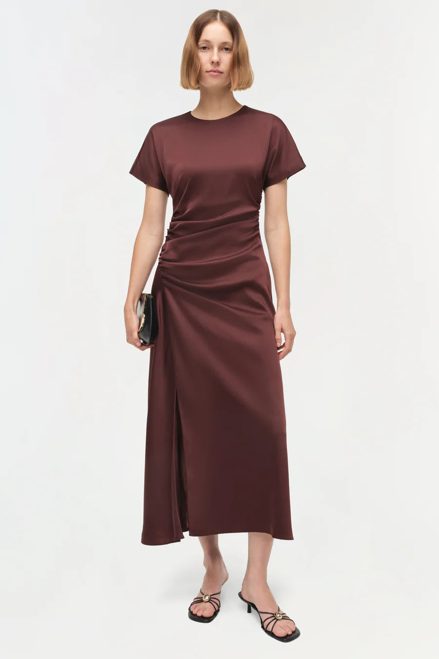 Made from lustrous satin, this midi dress features a softly ruched waist that shapes the body with precision. The fluid skirt falls cleanly from the hip, creating balance and poise. Elegant simplicity with a modern finish.
