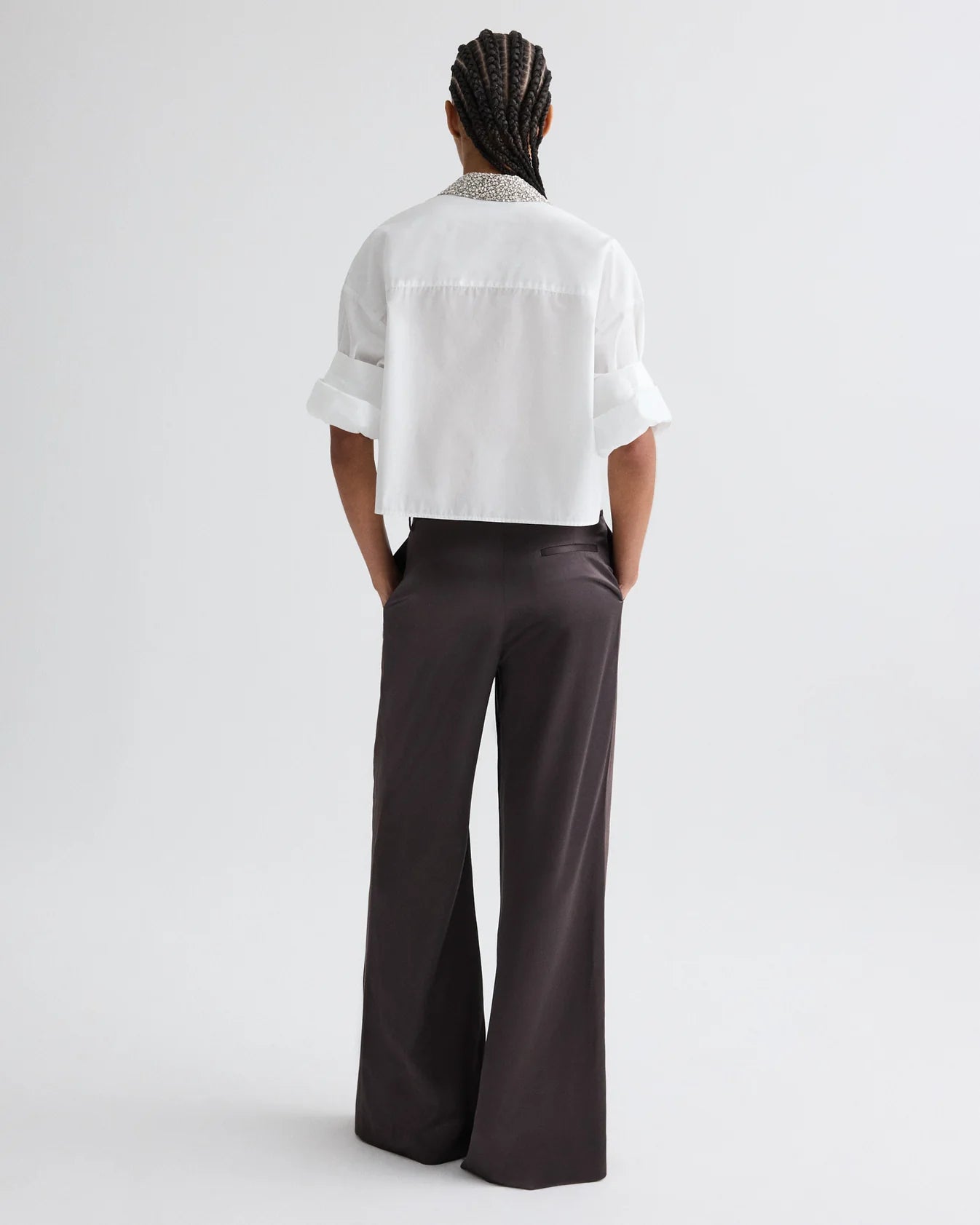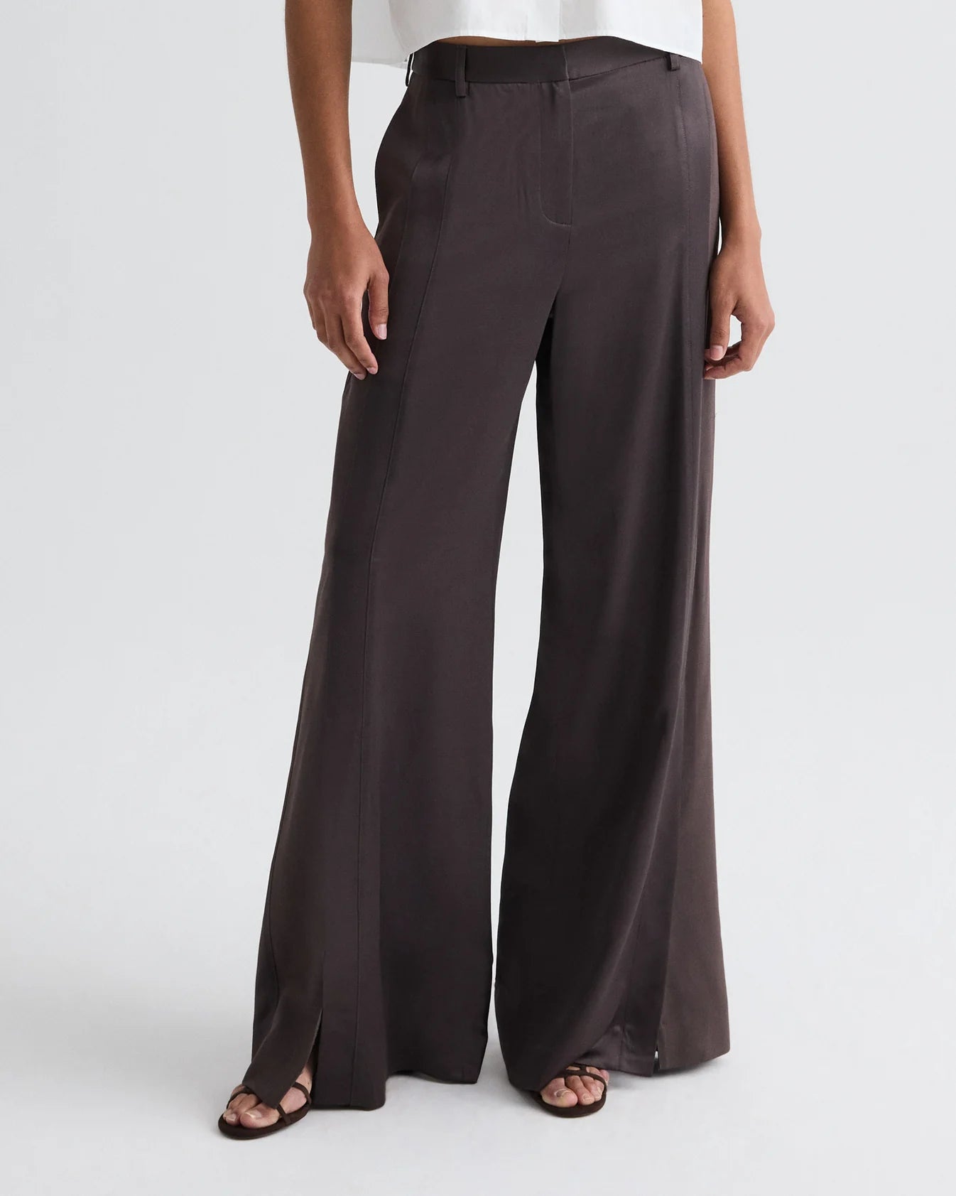 High rise, wide leg pants in shiny viscose wool satin. Fabric is viscose wool satin with a lustrous finish and soft, structured drape. The Taite Pant is a fluid silhouette with pressed front creases and satin tuxedo side stripes. Designed with front slits at the hem for movement. Complete with belt loops, side pockets, back welt pockets, and a concealed zip and hook closure.