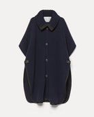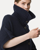 cosseting by nature, the wool–and–cashmere poncho in a half–fisherman's rib is an outfit–friendly versatile accessory that can be used with any outfit. it opens at the front with a turn–up neck and has been trimmed with faux–nappa bands down the sides and on a fastening finished with metal–detailed buttons. neat frogging on the curved hemline secures this garment at either side.