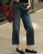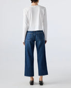 This cropped, wide straight leg is our easiest fit yet. Cut from premium rigid denim with a mid rise, this pair is meant to sit low on the hips for a relaxed look. Thoughtful distressing throughout. Denim hem. Zip fly.