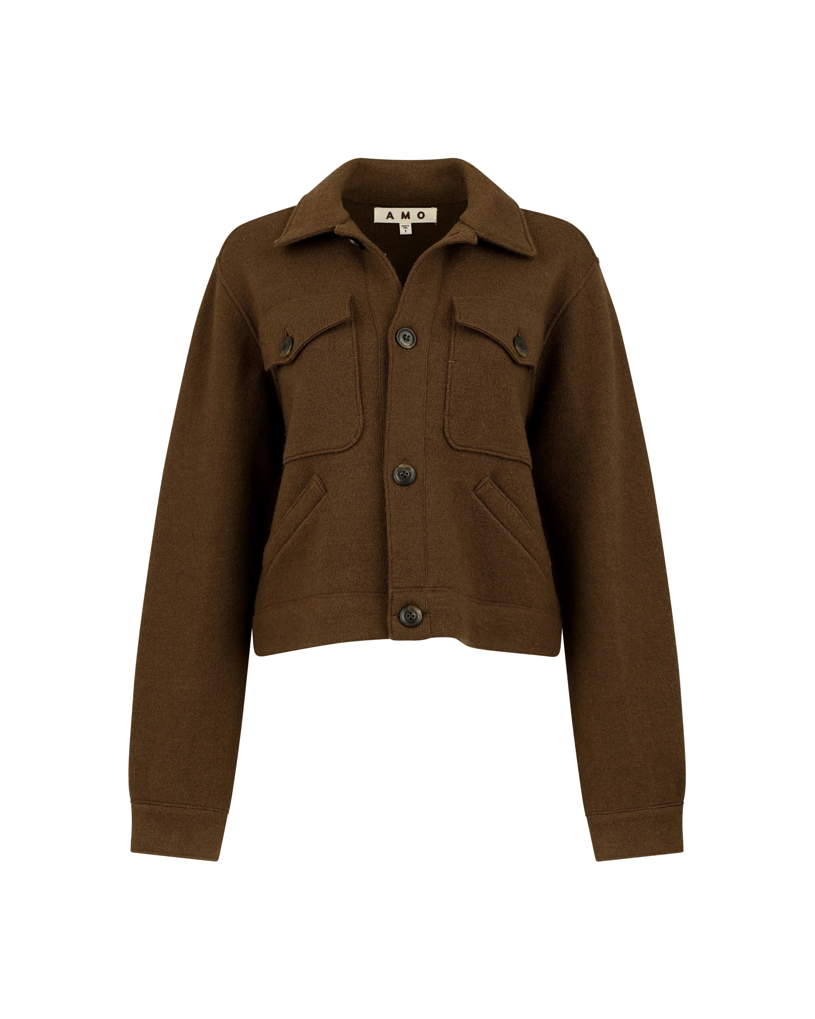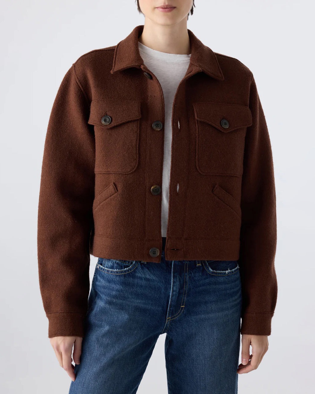 A classic cropped trucker style jacket with a slightly shrunken fit, shaped at the small of the back for a flattering silhouette. Crafted with denim seams that contour the body, it features chest flap pockets, shank
