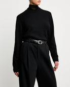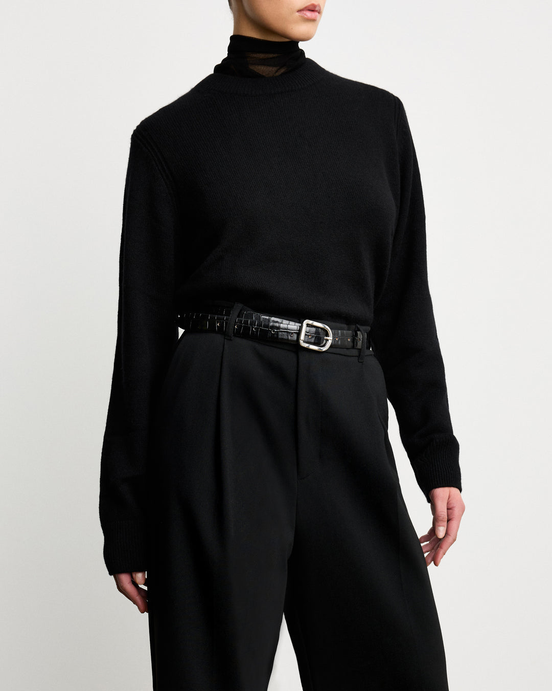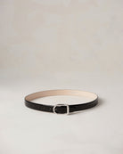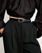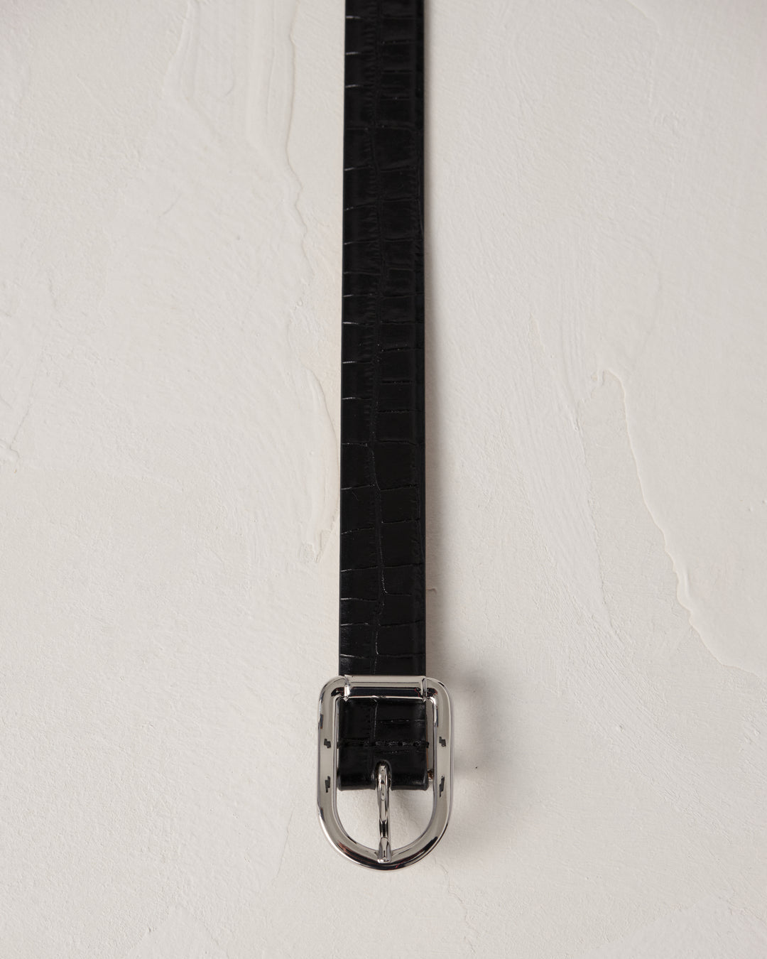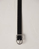 The belt features a rounded rectangular silver-toned buckle that is modernist and minimalist at once.
